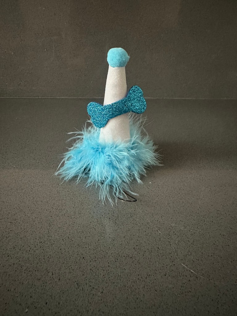 Köpek şapkası; 12 cm yükseklik 6 cm çapındadır. İçi elyaf dolgulu külah şeklinde 2 cm çapında ponponlu kukuleta simli eva ile kemik tasarıma sahiptir. Taban kısmında otriş tüy ya da ponpon bulunur. Şapkanın 30 cm uzunluğunda ince lastiği mevcuttur.